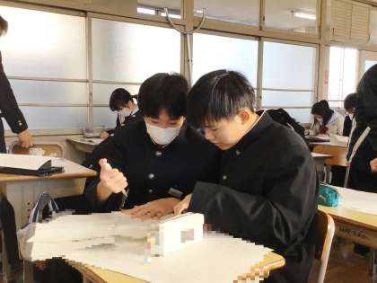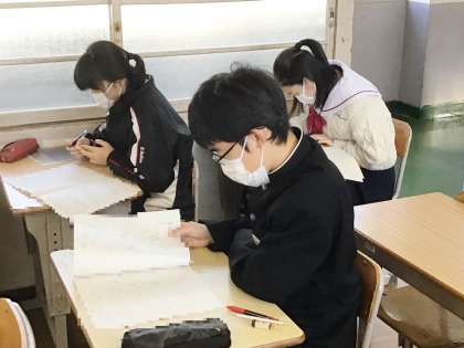 12/13(水) 授業の様子です(3年生) 1 公開日 2023/12/13 更新日 2023/12/13 お知らせ 3年生の授業の様子です。 31学級は、数学の授業の様子です。いよいよ明日は学習診断テストです。対策プリントを集中して解いていました。解き終わった生徒は、級友と解き方・考え方について確認していました。積極的に学び合っている様子から、明日のテストにかける気持ちが伝わってきました。