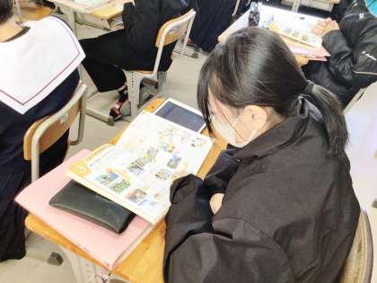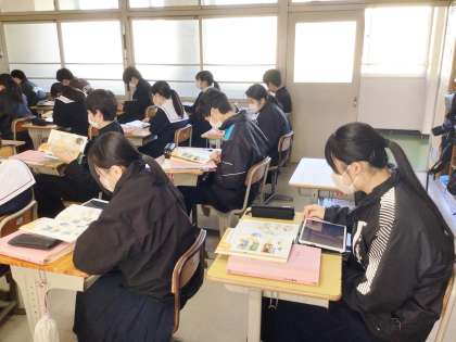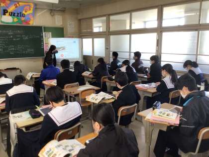 21学級は、家庭科の「さまざまな食品とその選択」の授業の様子です。食料自給率の推移のグラフを見ながら、外国への食料依存が高いことを再確認していました。