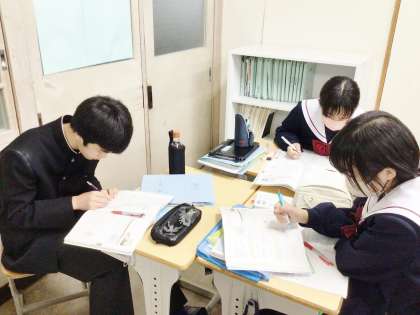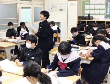 12/15(金) 授業の様子です(1年生) 2 公開日 2023/12/15 更新日 2023/12/15 お知らせ 12学級は、数学の「空間図形」の授業の様子です。平面と直線の位置関係の問題を解いていました。解き終わった生徒は班で確認し、全体の話し合いで自信をもって解き方を発表していました。一番下の写真は、解き方・考え方を確認した後の満面の笑みです。