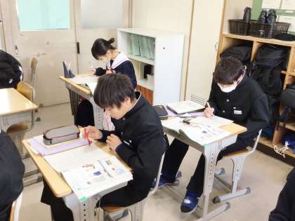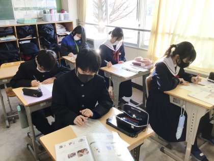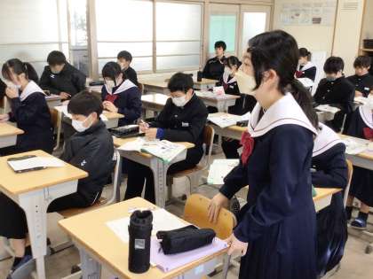 12/20(水) 授業の様子です(1年生) 2 公開日 2023/12/20 更新日 2023/12/20 お知らせ 12学級は、英語の「不定詞(to+動詞の原形)」の授業の様子です。Unit9の本文で不定詞が使われている部分を確認し、発表していました。