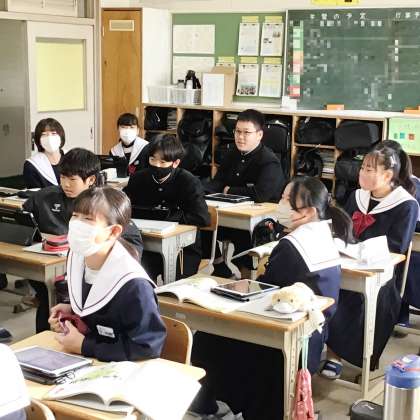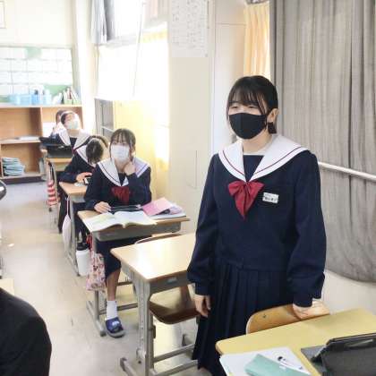 13学級は、家庭科の「目的に応じた衣服の選択」の授業の様子です。衣服の社会生活を送る上での3つのはたらきについて確認していました。レジャーランドでの服装について、様々な考えが出て、盛り上がっていました。