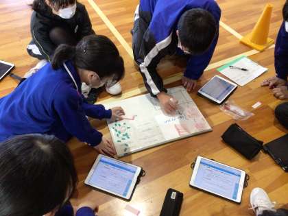 2年1組で保健体育のバレーの研究授業を行いました。生徒はマグネットや付箋を使って、チームの作戦を真剣に考えていました。作戦通り、相手の返球をひろって攻撃できた時は、チームみんなで喜び合っていました。
