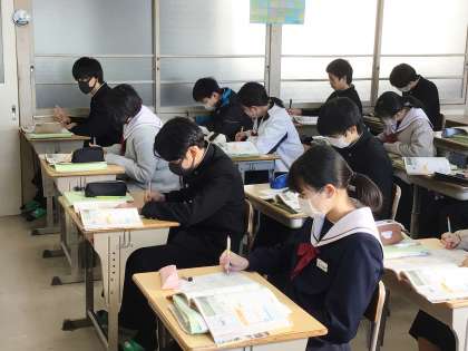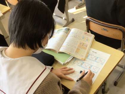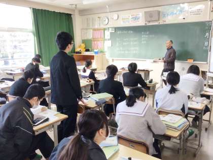 32学級は、社会の「価格の動き」の授業の様子です。市場価格の動きについて、「需要と供給の変化と価格」の資料を見ながら学習用プリントにまとめ、理解を深めていました。また、資料から自分が考えたことを堂々と発言していました。