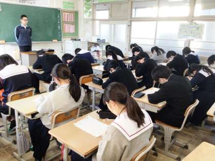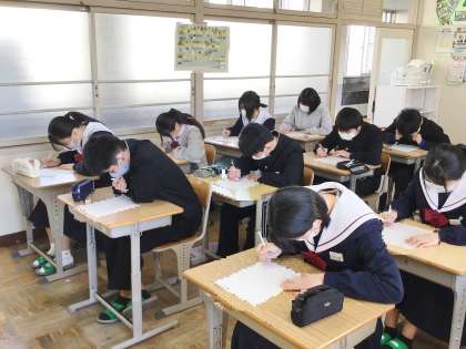 33学級は、英語の「Unit6」の単元テストの様子です。教室に入ると、緊張感がひしひしと伝わってきました。
