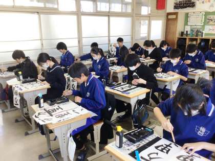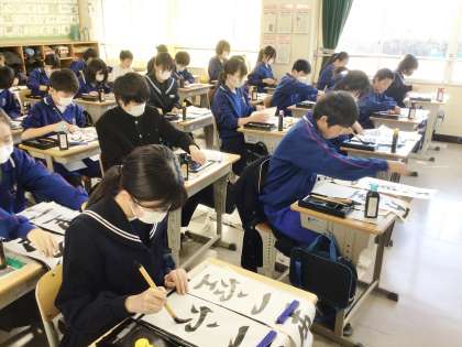 2,3限に書き初め大会が行われました。1年生は「万里一空」2年生は「笑門来福」3年生は「理想の実現」を書きました。どの教室も張りつめた空気の中、真剣に取り組んでいました。生徒たちの表情から、今年一年にかける意気込みが伝わってきました。