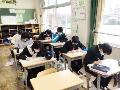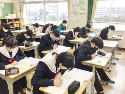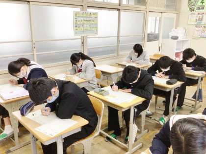 33学級は、英語の授業の様子です。今まで学習した範囲の確認テストを行っていました。もうすぐ始まる入試を意識し、一問一問集中して解き、解き終わった後は何度も見直しをしていました。