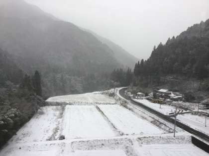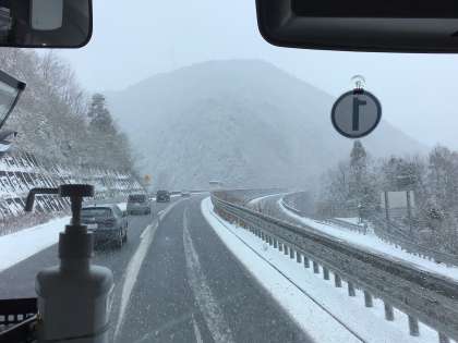 次の休憩地、松ノ木峠に向け、高速道路を走行中です。 雪が降ってきました。
