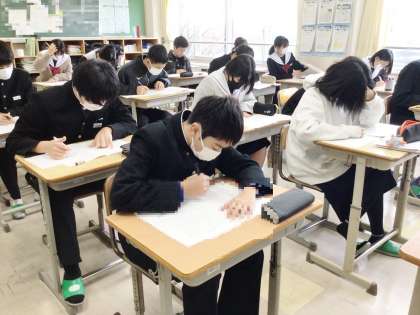 32学級は、英語の授業の様子です。入試対策の問題を集中して解いていました。来週は私立高校の一般入試です。今までの学習の成果をすべて発揮して、合格の笑顔が見られることを願っています。