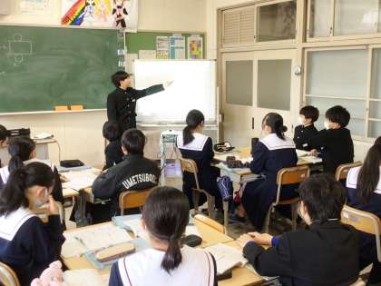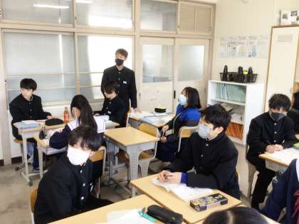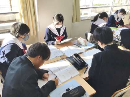 12学級は、数学の「立体の体積と表面積」の授業の様子です。立体の表面積の求め方について、練習問題を解きながら確認していました。解き方を確認する話し合いでは、積極的に発言していました。