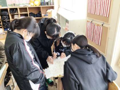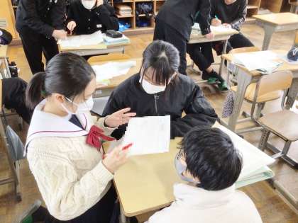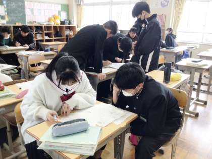 31学級は、数学の授業の様子です。「円の性質」の単元テストを返却された後、解けなかった問題を級友と学び合いながら、解き方、考え方を確認していました。