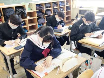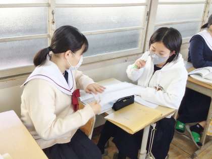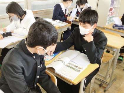 33学級は、理科の「自然環境と人間」の授業の様子です。自然災害について、ノートにまとめたり、級友と話し合ったりしながら、確認していました。