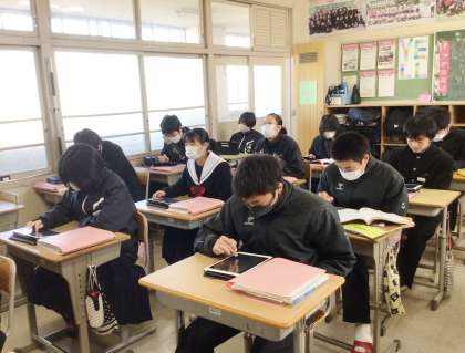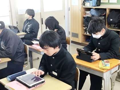 2/8(木) 授業の様子です(2年生) 1 公開日 2024/02/08 更新日 2024/02/08 お知らせ 2年生の授業の様子です。 21学級は、家庭科の「持続可能な食生活」の授業の様子です。食料自給率の資料を見ながら、課題や今後の取組について、学習用タブレットに自分の考えをまとめていました。