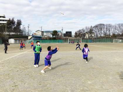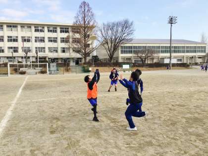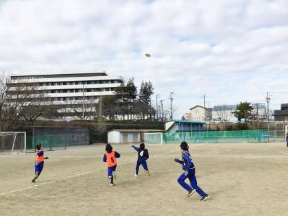 11学級は、体育の「アルティメット」の授業の様子です。試合を行っていました。パスワークは以前見たときより、格段に上達していました。「ロングパスだ〜、頼むぞ!」「ナイスキャッチ!」という声が運動場に響き渡っていました。下の3枚の写真の中にディスクが映っています。どこにあるかわかりますか?
