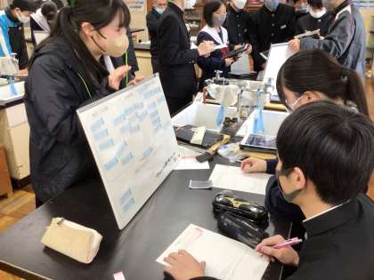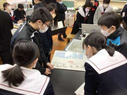3年3組で理科の研究授業を行いました。「プラスチック問題から地球の未来を考える」をテーマに、活発に話し合っていました。海洋ゴミ問題や処理問題、地球温暖化問題など様々な視点から対応策を考えていました。プラスチックから電気を発電するなど、各班で発想豊かな面白いアイデアを考え出し、議論は盛り上がっていました。