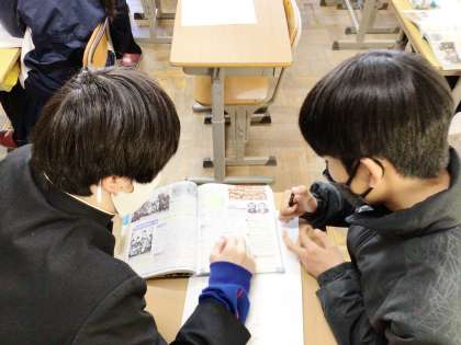 23学級は、社会の「近代的な国際関係」の授業の様子です。中国や朝鮮との関係について、条約の内容を読み取りながら理解を深めていました。