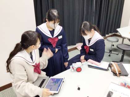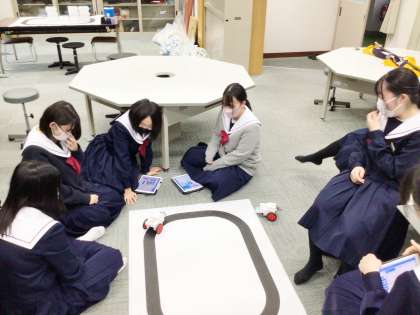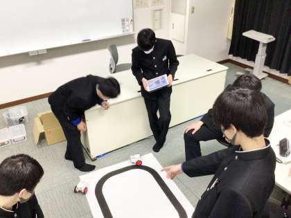 32学級は、技術の「プログラミング」の授業の様子です。プログラミングして制御した車がライントレースをしています。車を自在に動かしている生徒を見て、技能の高まりを強く感じました。