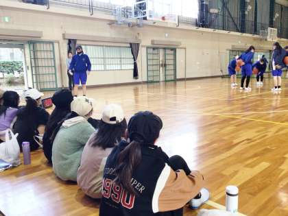 写真は、上から女子ソフトテニス部、男子バスケットボール部、女子バスケットボール部の見学を行っている様子です。