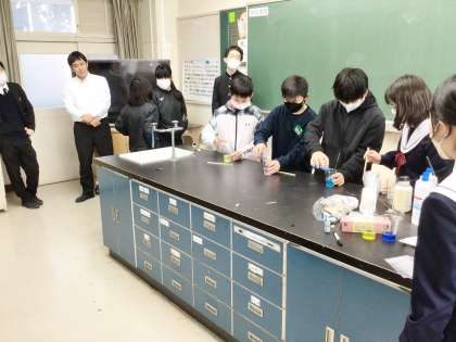 写真は、上からバレーボール部、情報科学部の見学を行っている様子です。情報科学部は、スライム作りの体験活動を行っていました。