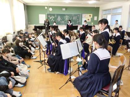 写真は、上から吹奏楽部、ボランティア部の見学を行っている様子です。