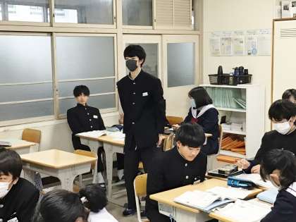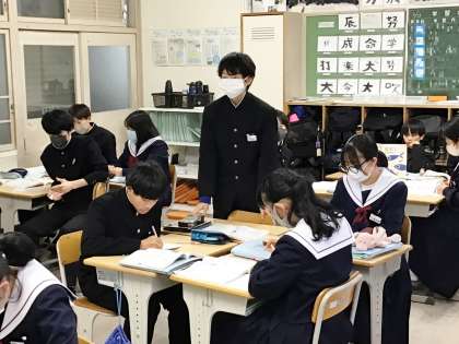 12学級は、数学の「データの活用」の授業の様子です。必要なデータの収集を行いながら、データの傾向や特徴を調べていました。調べた後、積極的に自分の考えを発表していました。