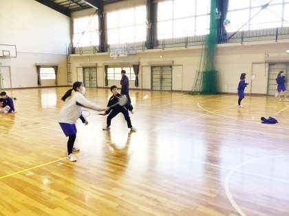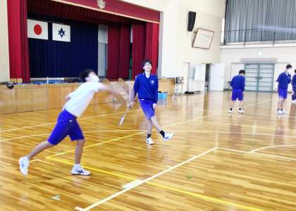 32学級は、体育の「バトミントン」の授業の様子です。お互いに声を掛け合うなど級友との触れ合いを大切にしながら、楽しそうに試合を行っていました。