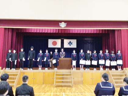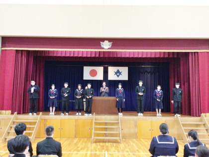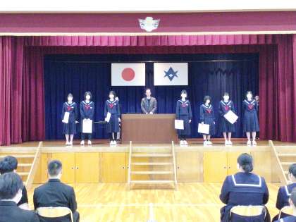 全校集会では、作文、書道(書き初めコンクール等)、科学研究、皆勤賞、梅台褒賞の表彰を行いました。表彰された生徒の誇らしげな表情を見て、とても嬉しくなりました。