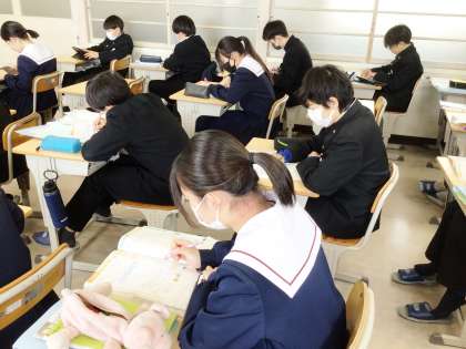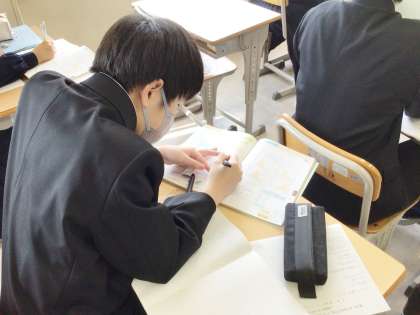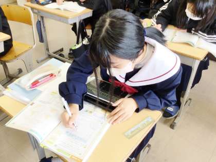 12学級は、数学の「データの活用」の授業の様子です。週末問題を解いていました。解いている表情から、集中して取り組んでいることがよくわかります。