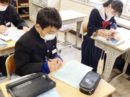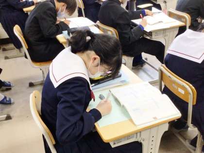 12学級は、数学の「データの活用」の授業の様子です。自己評価表の「単元の振り返り」を集中して書いていました。