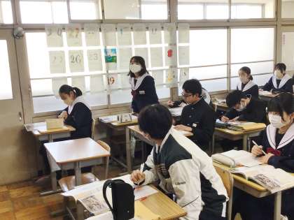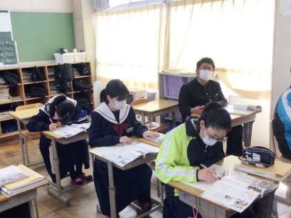 23学級は、社会の「韓国と中国」の授業の様子です。韓国と中国の政治の変化について、デジタル教科書の映像を見ながら確認し、ノートにまとめていました。また、積極的に挙手し、発言していました。