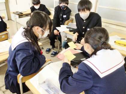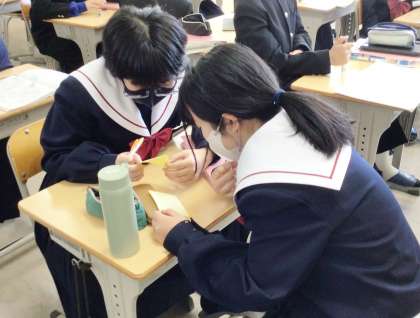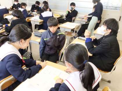 12学級は、国語の「ことばのきまり」の授業の様子です。助詞や助動詞などの品詞について学習していました。3つ以上の品詞を使って、「1年間の思い出」の文を作っていました。完成した生徒は、級友と確認していました。