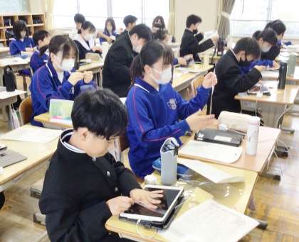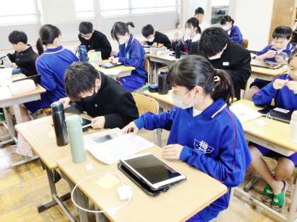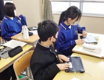 13学級の朝の会の様子です。学習用タブレットの設定を行っている場面です。