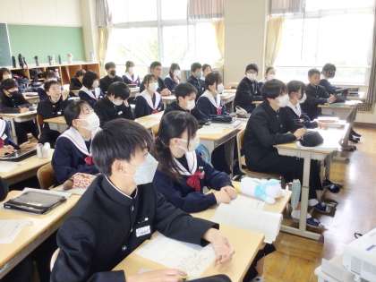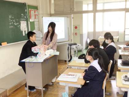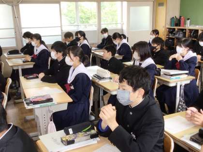 21学級は、家庭科の「授業開き」の授業の様子です。クイズを取り入れながら五感の大切さについて説明していました。