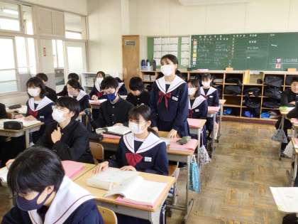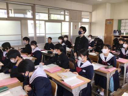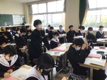 23学級は、国語の「アイスプラネット」の授業の様子です。登場人物同士の関係について話し合っていました。積極的に発言する生徒が多く、授業に活力を感じました。