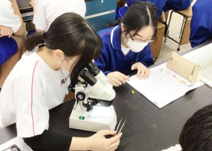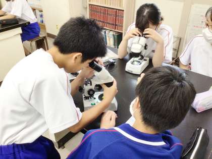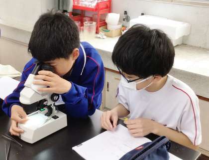 11学級は、理科の「植物のなかま」の授業の様子です。校庭に咲いているアブラナの花を顕微鏡で見ながら、めしべ、おしべ、がくなどを確認していました。「すごい、すごい、よくわかる!」という呟きが聞こえてきました。