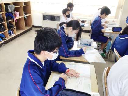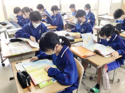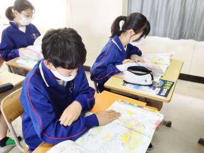 11学級は、社会の「世界の姿」の授業の様子です。地図帳で様々な国を探しながら、内陸国、海洋国について学んでいました。