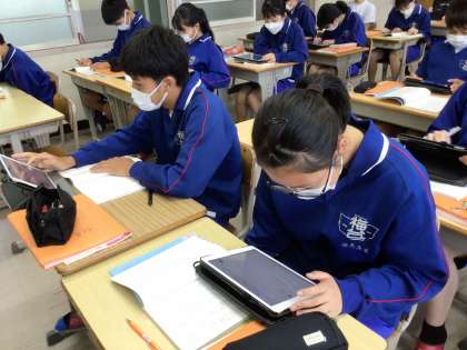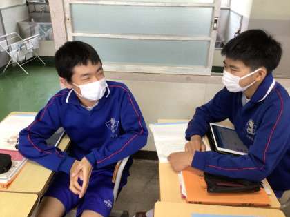 33学級は、国語の「握手」の授業の様子です。難しい語句の意味を学習用タブレットを使って調べたり、級友と話し合ったりしながら確認していました。