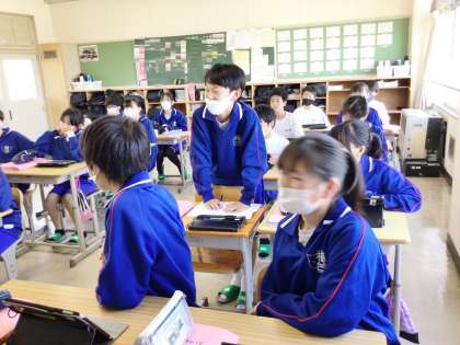 11学級は、家庭科の「自分の成長と家族・家庭生活」の授業の様子です。「これまでの自分」を振り返っていました。小学校の思い出を積極的に発言していました。