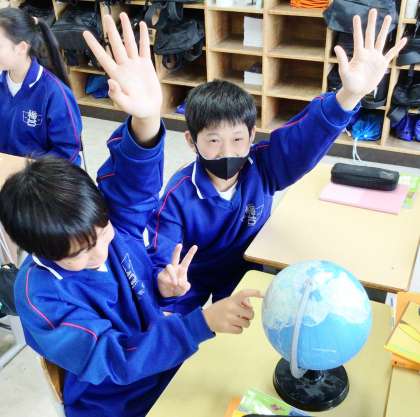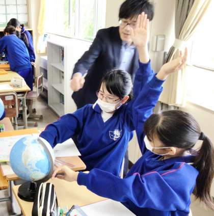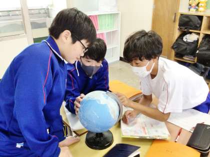12学級は、社会の「世界の姿」の授業の様子です。地球儀を使って国を探していました。「インドネシアはアジアだから、この辺りだな」と呟きながら、楽しそうに探していました。国を探せた人は「見つけました!」と挙手していました。