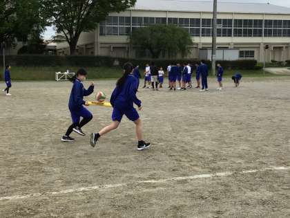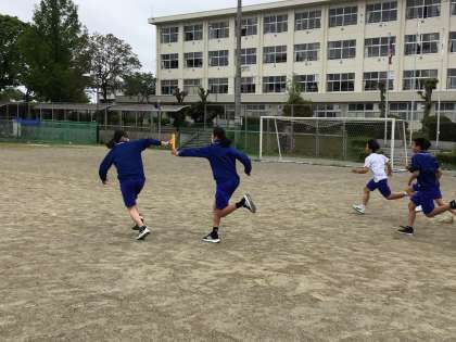 31学級は、体育の「体育祭練習」の授業の様子です。種目ごとに分かれて、どうすると上手くいくかを考えながら、練習を行っていました。
