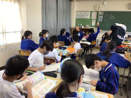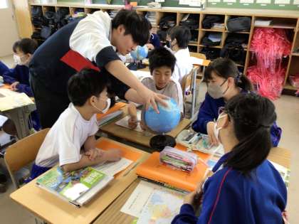 11学級は、社会の「地球上の位置を表そう」の授業の様子です。地球儀や地図帳を使って赤道の位置や様々な国の場所を確認するなどして、緯度や経度について学びました。