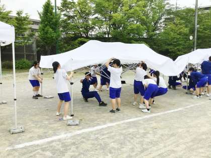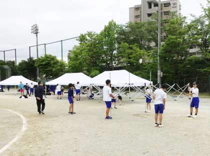 5/15(水) ボランティア活動、ありがとうございます! 公開日 2024/05/15 更新日 2024/05/15 お知らせ 明日は全校練習を予定しています。3年生のボランティアの生徒とともに全校生徒分のテントの設営を行いました。全校練習では、テントの日陰で連絡を聞いたり、自分が出場しない種目はテントの中で水分を取ったりと、熱中症防止対応を行っていきます。テント設営のボランティア活動、ありがとうございました。