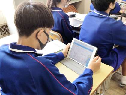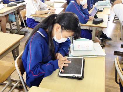 21学級は、家庭科の「災害への備え」の授業の様子です。地震対策について様々な事例を解きながら、「どのような行動をとる必要があるのか」を考えていました。