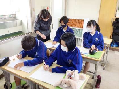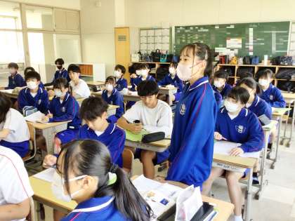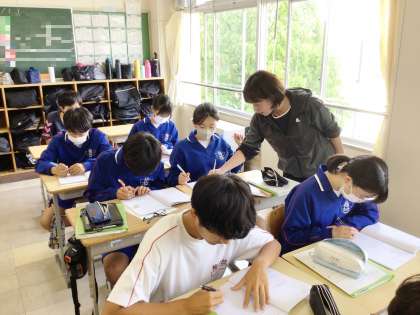 22学級は、理科の「化学変化と原子・分子」の授業の様子です。酸化銅と炭素の化学変化を化学反応式に表していました。化学反応式に表すことができた生徒は、教科担任と確認していました。全体の話し合いでは、自分の解き方・考え方を堂々と発言していました。
