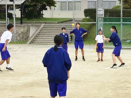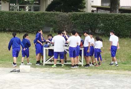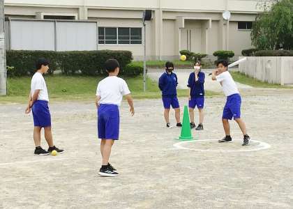 31学級は、体育の「ベースボール型球技:ペサパッロ」の授業の様子です。どこにどういう打球をとばせばいいのか考えながら、気持ちよくバットを振っていました。「走れ、まだいけるぞ!」という声が運動場に響き渡っていました。また、熱中症防止対策として、定期的に水分補給の時間を確保しながら活動を行っています。