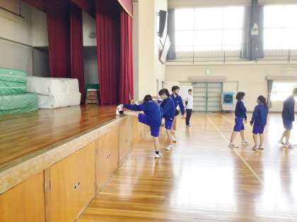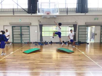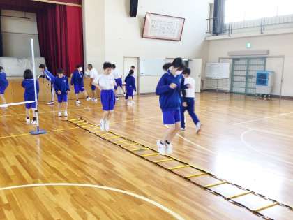 21学級は、体育の「走り高跳び」の授業の様子です。本日から、この単元に入りました。グループに分かれてウオーミングアップを行っていました。
