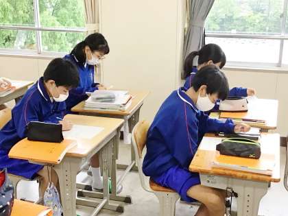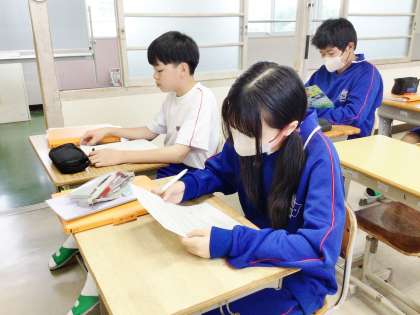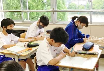 11学級は、社会の「時差の調べ方」の授業の様子です。練習問題を集中して解いていました。時差の問題は、定期テストや学習診断テストでもよく出題されます。確実に解けるようにしておきましょう。