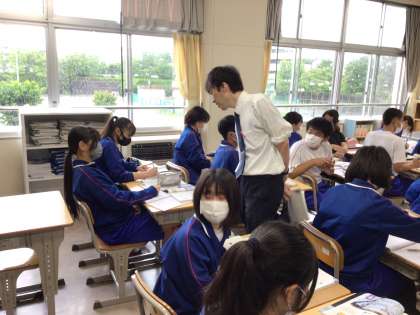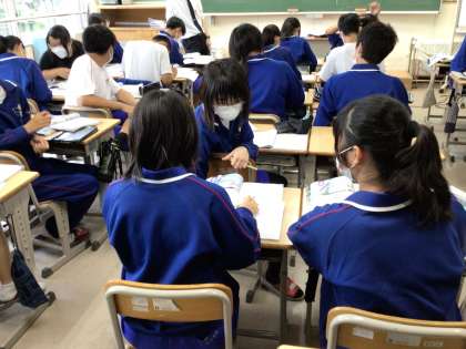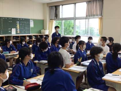 32学級は、理科の「仕事の大きさ」の授業の様子です。様々な問題を解き、近くの席の生徒同士や全体で確認しあうことで、仕事の大きさが変わる条件についての理解を深めました。