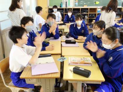 21学級は、英語の授業の様子です。ALTが自己紹介をクイズ形式で行っていました。生徒たちは、ALTの明るい雰囲気にのって自然と拍手が湧き起るなど、とても楽しそうにクイズを解いていました。