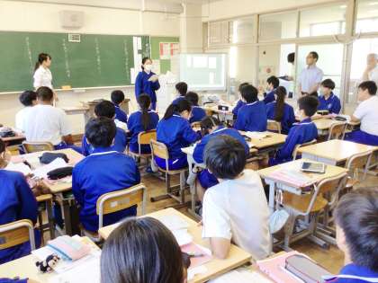 教育実習生は、笑顔で明るく元気に生徒に語り掛けるとともに、生徒の考えを大切にしながら授業を進めていました。