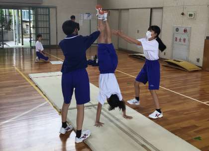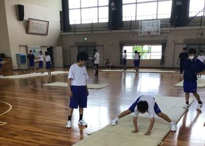 6/7(金) 教育実習生が研究授業を行いました 公開日 2024/06/07 更新日 2024/06/07 お知らせ 4限に、教育実習生の保健体育の研究授業が行われました。 生徒たちは、マット運動の連続技をよりスムーズに、より美しく行うにはどうすればいいかについて、班で話し合ったりサポートしながら練習したりして、積極的に考えていました。 教育実習生は、各班を巡回して生徒の様子をしっかりと見て、アドバイスを送ったり見本を示したりしながら授業を進めていました。 1年